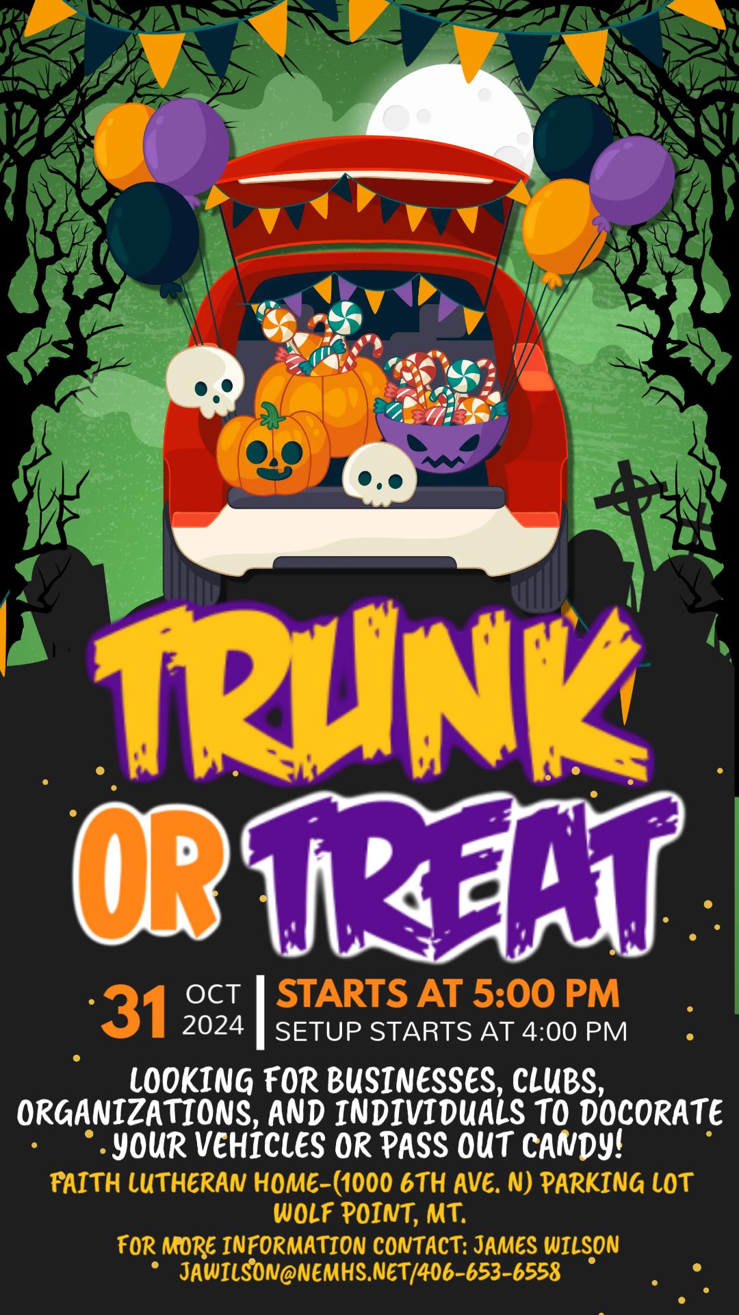 NEMHS EMS is holding their annual Trunk or Treat to offer a safe place for families to gather on Halloween. Prizes are available for the best costume and the best-decorated trunk! Businesses, clubs, organizations and individuals are invited to decorate their vehicles and/or hand out candy. Set up for this event begins at 4:00 pm. For additional information please contact James Wilson at 406-653-6558.